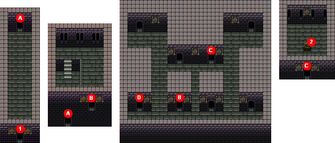 All unmarked doors are dead ends, loop back to themselves, or go back to a previous level.